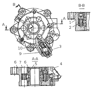 Рис. 276. Клапан управления гидроусилителем рулевого управления: 1 - плунжер глухого отверстия; 2,5-пружины; 3 - пробка резьбовая; 4 - клапан обратный; 6 - золотник; 7 - плунжер реактивный; 8 - корпус клапана; 9 - кольцо уплотнительное; 10 - клапан предохранительный